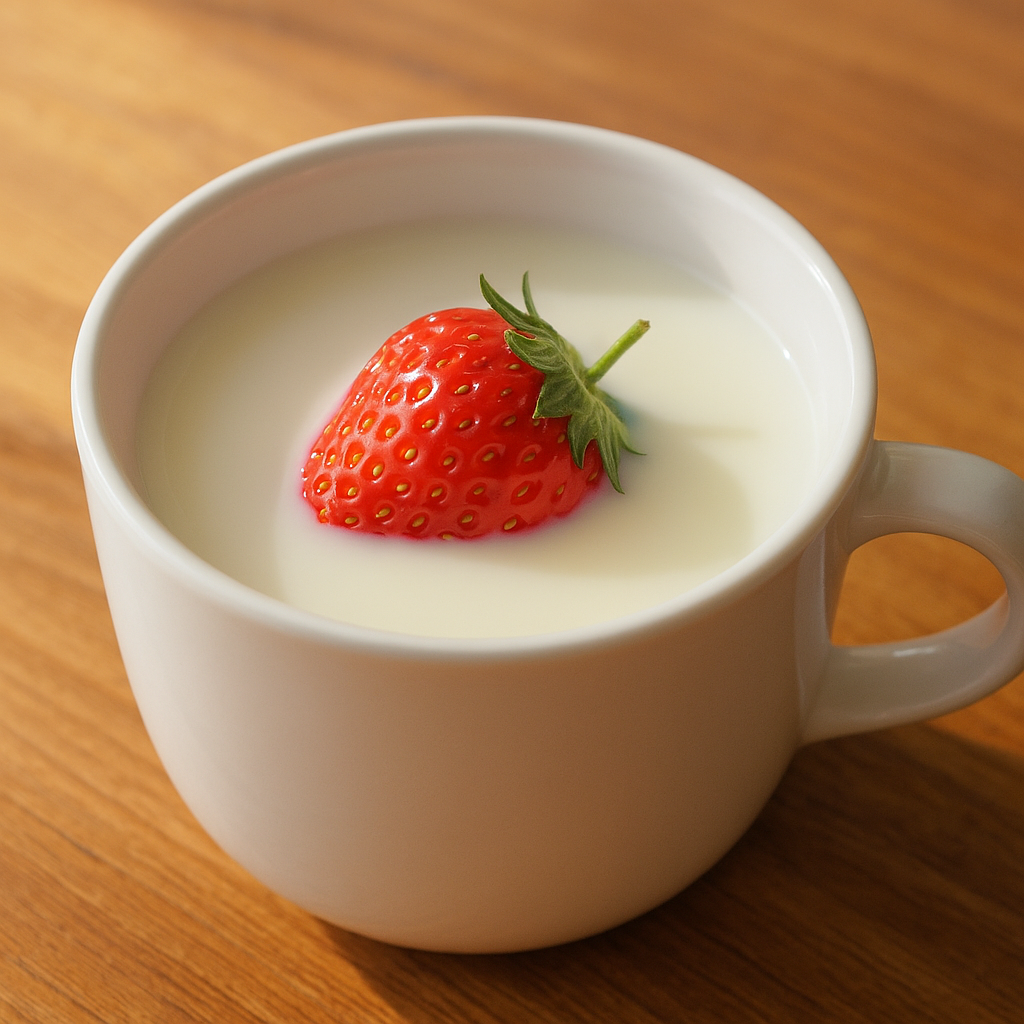 普通の人はこんな食べ方をしないと思いますが、意外と美味しいのでcopilotにイメージ画像を作成してもらいました。hot milkの中にいちごを入れて食べるというものです。いちごのシーズンが冬から5月初旬までの寒い時期なので、hot milkと相性がいいです。