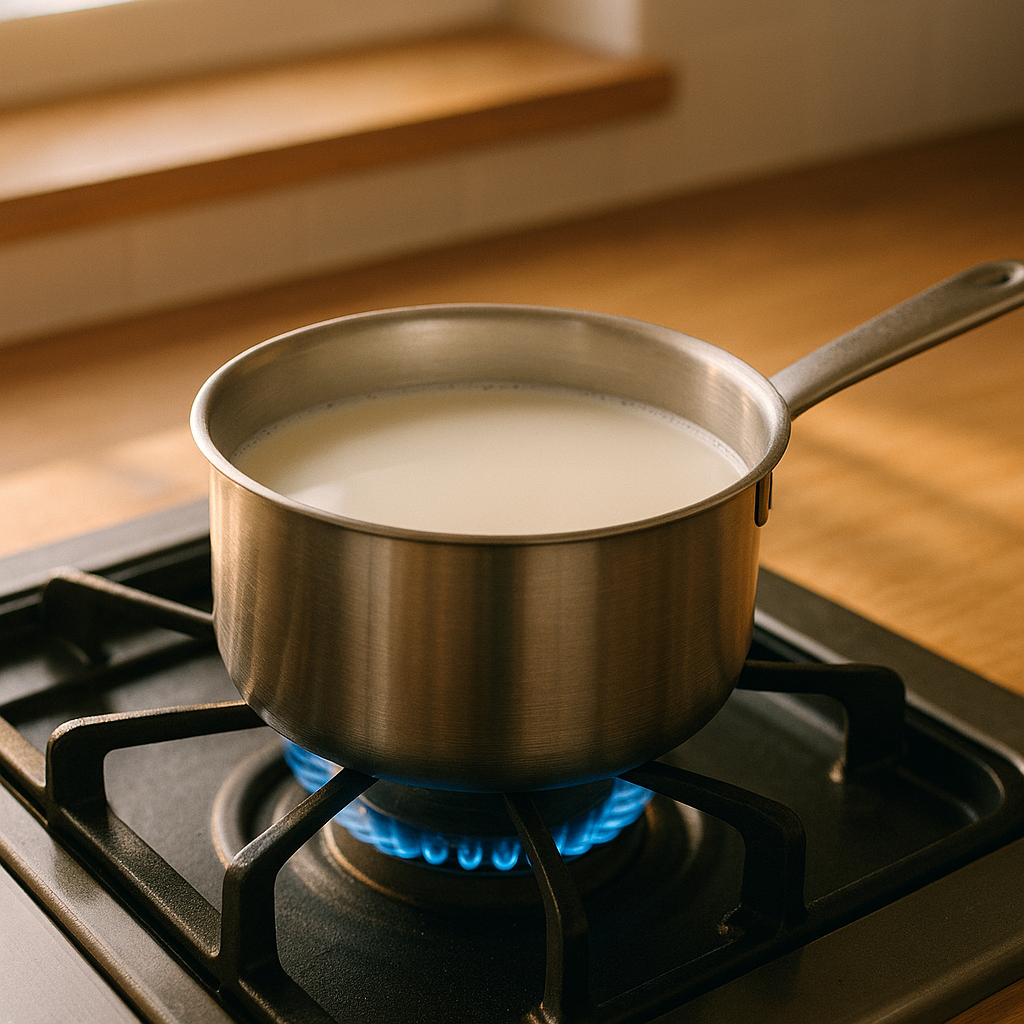 - 私の場合、ガスコンロで鍋に牛乳を入れて温めてからコーヒーカップに移します。