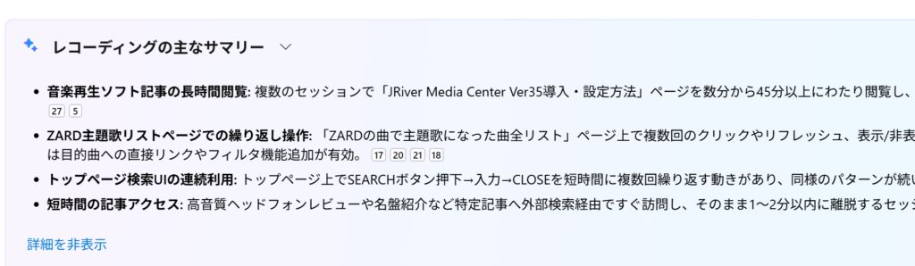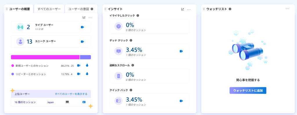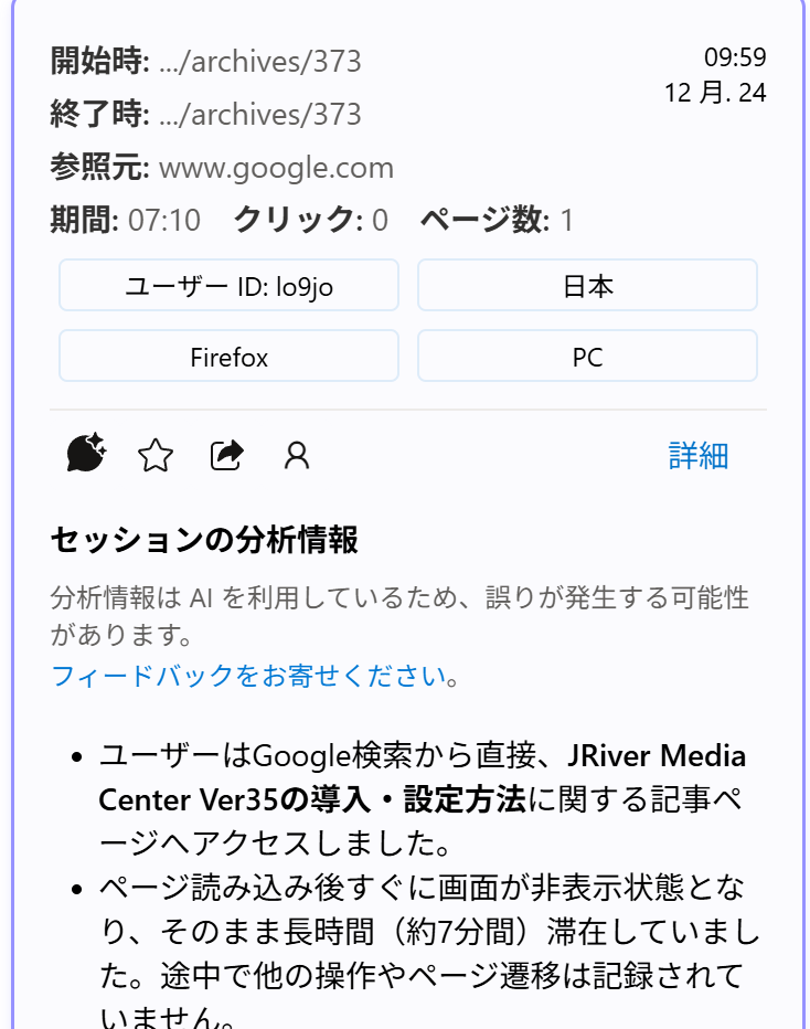 AIを活用した具体的なコメントに驚きました。アクセス者の具体的な行動パターンまで教えてくれるのは、Micosoft Clarityだけではないでしょうか。