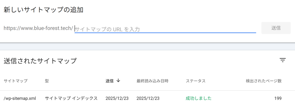 これをGoogle Search Consoleのサイトマップ-新しいサイトマップの追加に入力して送信ボタンを押します。