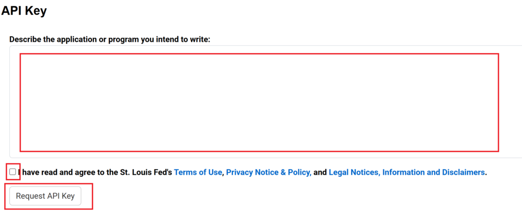 ここはAPI KEY取得の理由の欄で、アプリケーションまたはプログラムを記載しろと言っているのでPythonのコードを書きました。レ点を入れて赤枠Request API Keyをクリックします。